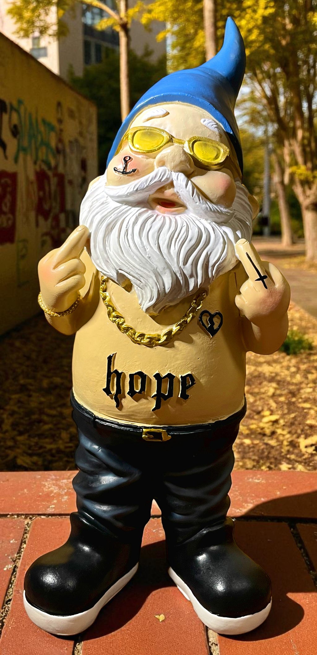 Der Gartenzwerg Rocker mit Tattoos und Stinkefinger macht sich wunderbar in deinem Wohnzimmer oder Garten. Schaffe eine coole Atmosphäre und sichere dir den ein oder anderen Blick. Perfekt als Geschenk an dich selbst oder deine Lieben.